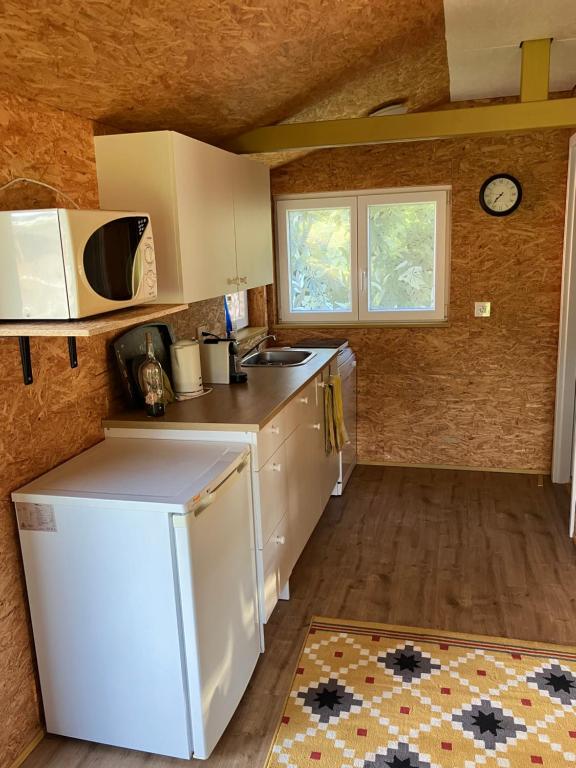 - Cuisine équipée : réfrigérateur combiné, lave-vaisselle, micro-ondes, plaques électriques (2), armoires de rangement, machine à café (type Nespresso), bouilloire.